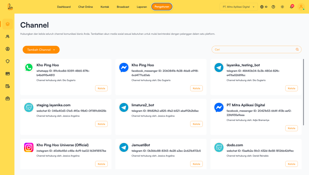 Pengguna dapat menghubungkan berbagai saluran aplikasi media sosial (seperti WhatsApp, Facebook Messenger, Instagram, Telegram, dan Webchat) ke dalam platform Layanika dengan Tambah Channel.