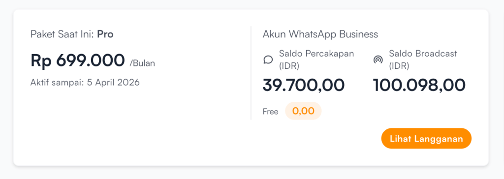 Bagian ini menampilkan informasi terkait langganan aktif dan saldo WhatsApp Business yang digunakan oleh pengguna.