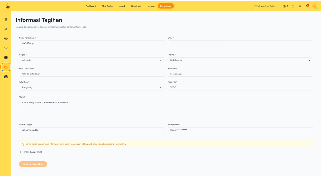 Masuk ke menu Pengaturan > Informasi Tagihan. Setelah itu sistem akan menampilkan halamanĀ Informasi Tagihan, lalu isi informasi seperti: