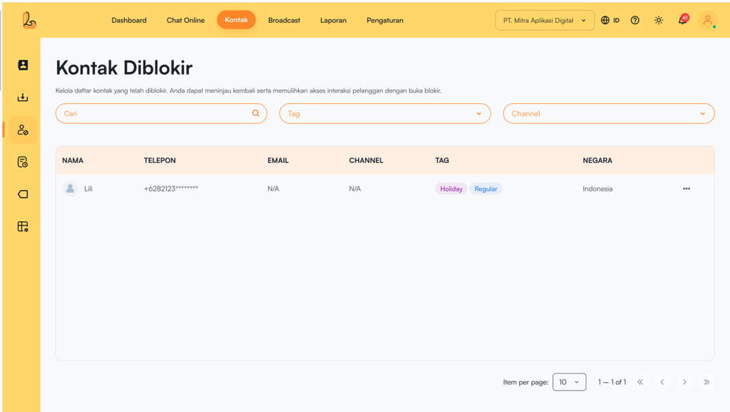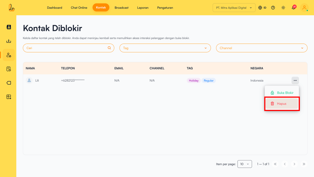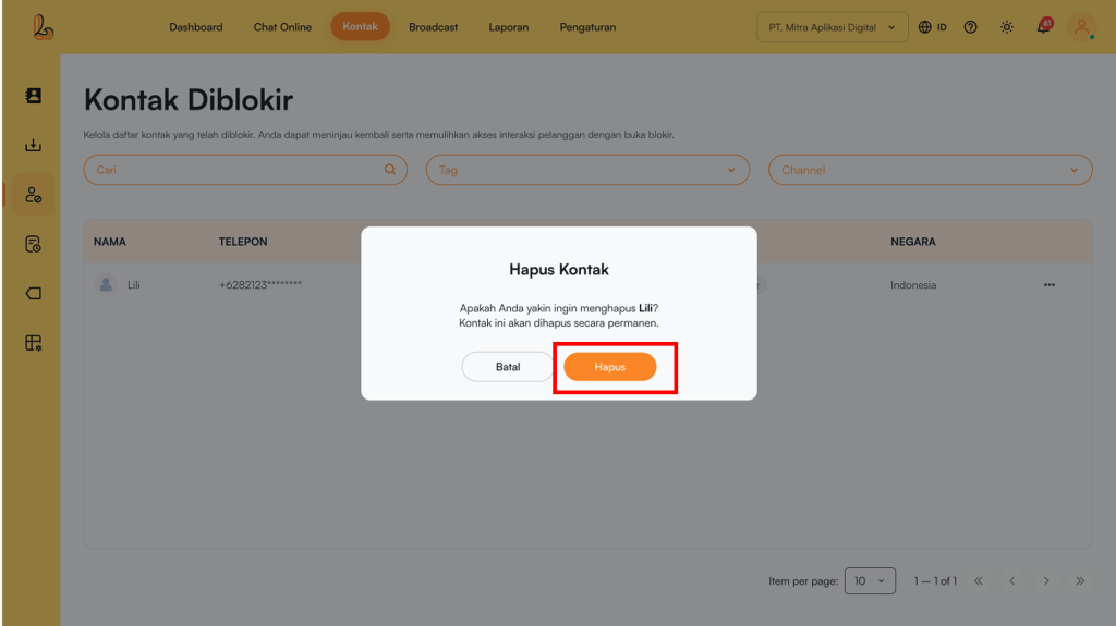 Pilih kontak pelanggan yang ingin anda hapus pada daftar kontak yang diblokir. Pilih aksi Buka Blokir yang terletak pada disebelah kanan Negara. Setelah itu, sistem akan mengirimkan konfirmasi apakah pengguna yakin untuk membuka blokir kontak. Pilih Buka Blokir untuk menghapus kontak.
