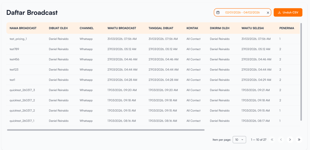 Daftar Broadcast pada Layanika adalah fitur laporan yang berisi seluruh aktivitas pengiriman broadcast yang telah dibuat, sedang berjalan, maupun yang sudah pada periode tertentu.
