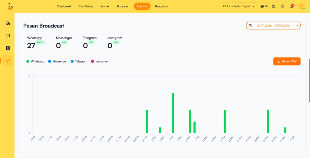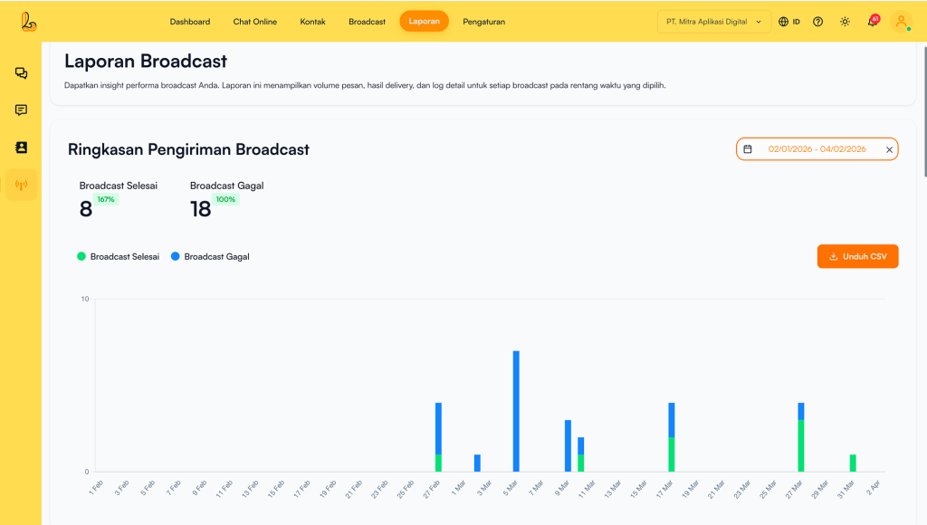 Laporan Broadcast pada Layanika adalah fitur laporan yang menyediakan data dan analisis terkait aktivitas pengiriman pesan broadcast kepada pelanggan pada periode tertentu. Fitur ini membantu bisnis dalam memantau performa kampanye serta mengevaluasi efektivitas komunikasi yang dilakukan.