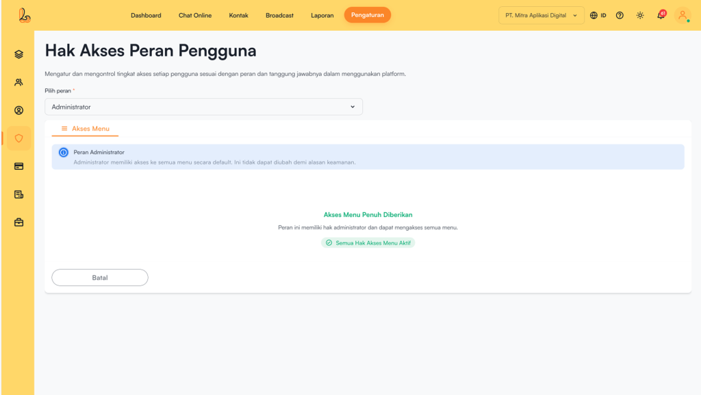 Buka menu Pengaturan > Peran Pengguna. Lalu pilih peran pada dropdown Pilih PeranĀ (Administrator / Supervisor / Agen). Setelah selesai, klik Simpan Hak Akses.