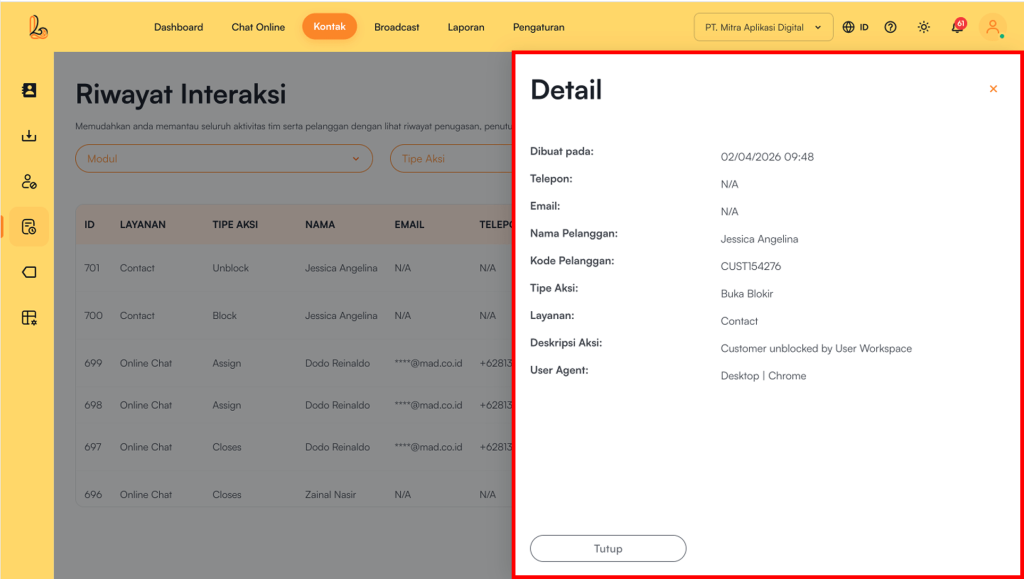 Pengguna dapat melihat detail interaksi tim dengan kontak pelanggan. Berikut panduan untuk melihat interaksi kontak:
