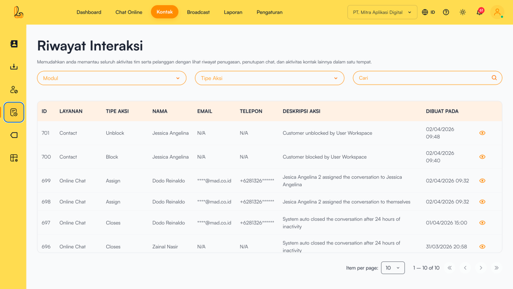 Pada menu Riwayat Interaksi menampilkan daftar interaksi pengguna dengan pelanggan. Menu ini memudahkan pengguna untuk memantau aktivitas tim serta pelanggan dengan melihat riwayat penugasan, penutupan chat, serta aktivitas kontak lainnya.