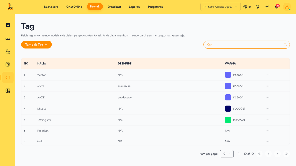 Dengan menggunakan tag, pengguna dapat mengorganisir data secara lebih terstruktur sehingga memudahkan pencarian, segmentasi, dan pengelolaan komunikasi.