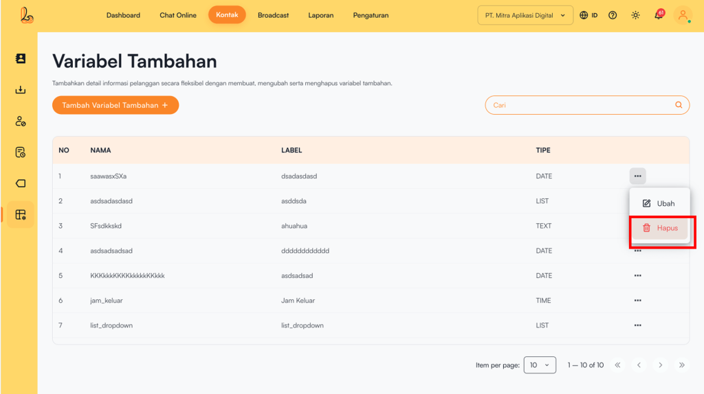 Pengguna dapat menghapus variabel tambahan pada menu kontak