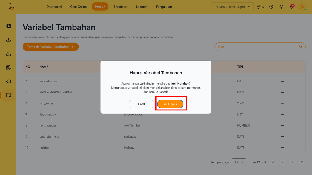 Untuk menghapus variabel tambahan, pilih variabel tambahan yang akan dihapus pada formulir kontak. Pili Hapus untuk menghapus variabel tambahan. Setelah sistem akan mengirimkan konfirmasi apakah pengguna yakin untuk menghapus variabel tambahan. Pilih Hapus untuk konfirmasi hapus variabel tambahan.