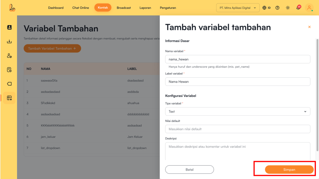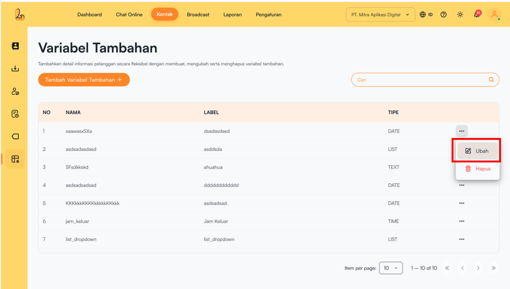 Pengguna dapat melakukan pengubahan deskripsi, nama variabel, label variabel, hingga tipe variabel. Pengguna dapat Mengubah Variabel Tambahan. Perubahan pada variabel akan otomatis pada semua kontak yang mengisi pada kolom variabel tambahan.