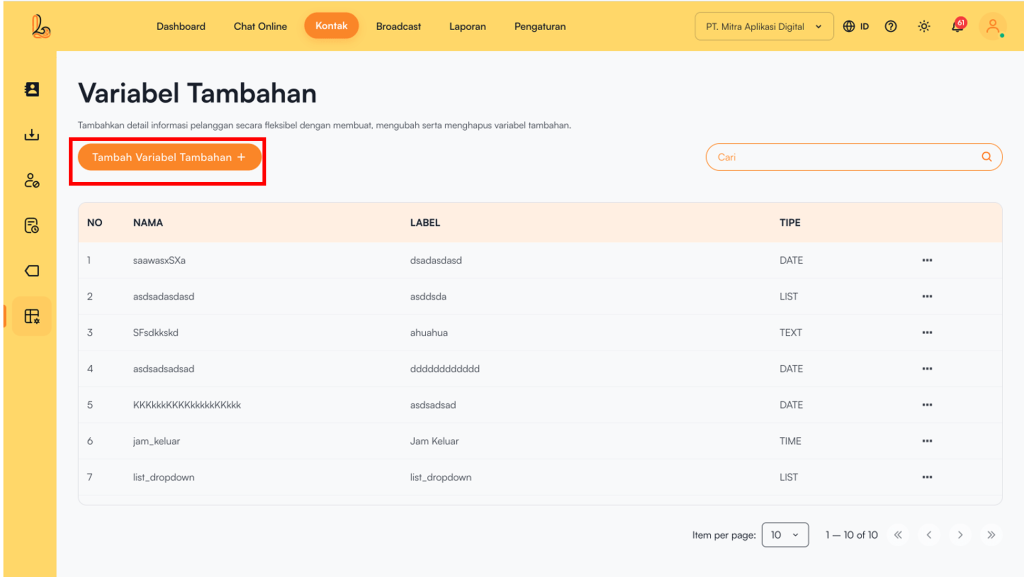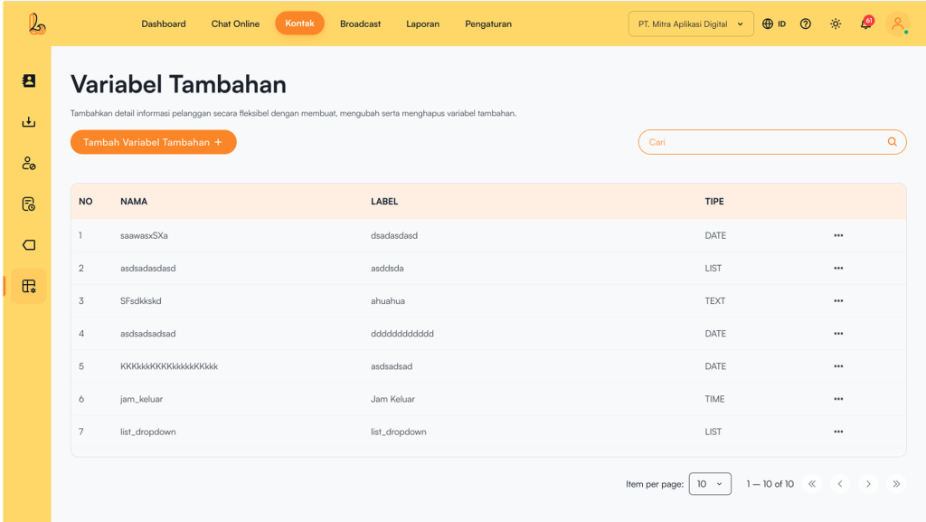 Menu Variabel Tambahan digunakan untuk menambahkan pada kontak pelanggan. Menu ini digunakan untuk menyimpan informasi yang belum tersedia pada kolom informasi utama.