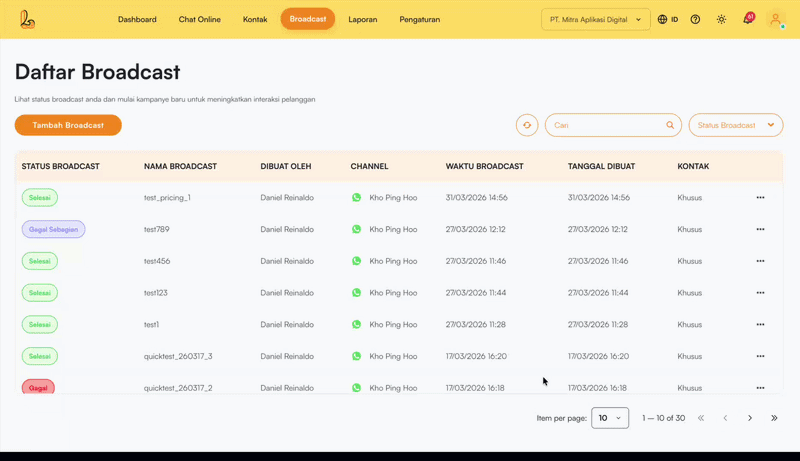 | Gagal | Broadcast gagal dikirim sepenuhnya. Tidak ada pesan yang berhasil dikirim ke target kontak |