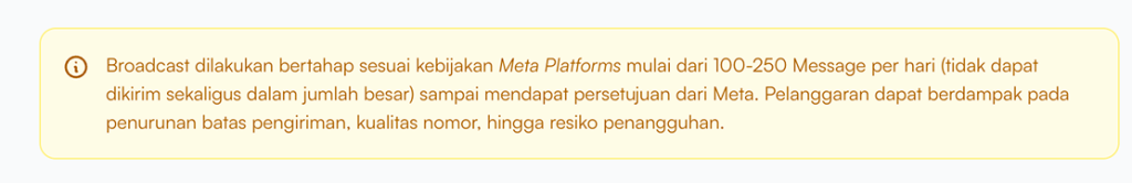 Catatan: Untuk pengiriman broadcast pertama, proses dilakukan secara bertahap sesuai kebijakan Meta (sekitar 100–250 pesan per hari) dan tidak dapat dikirim sekaligus dalam jumlah besar. Pelanggaran dapat berdampak pada penurunan batas pengiriman, penurunan kualitas nomor, hingga risiko penangguhan akun.