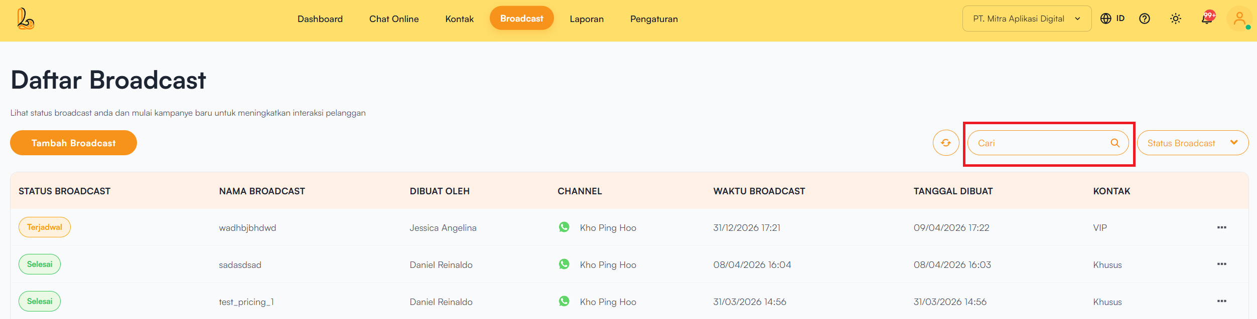 Fitur ini digunakan untuk mencari pesan broadcast berdasarkan nama broadcast dan status broadcast.