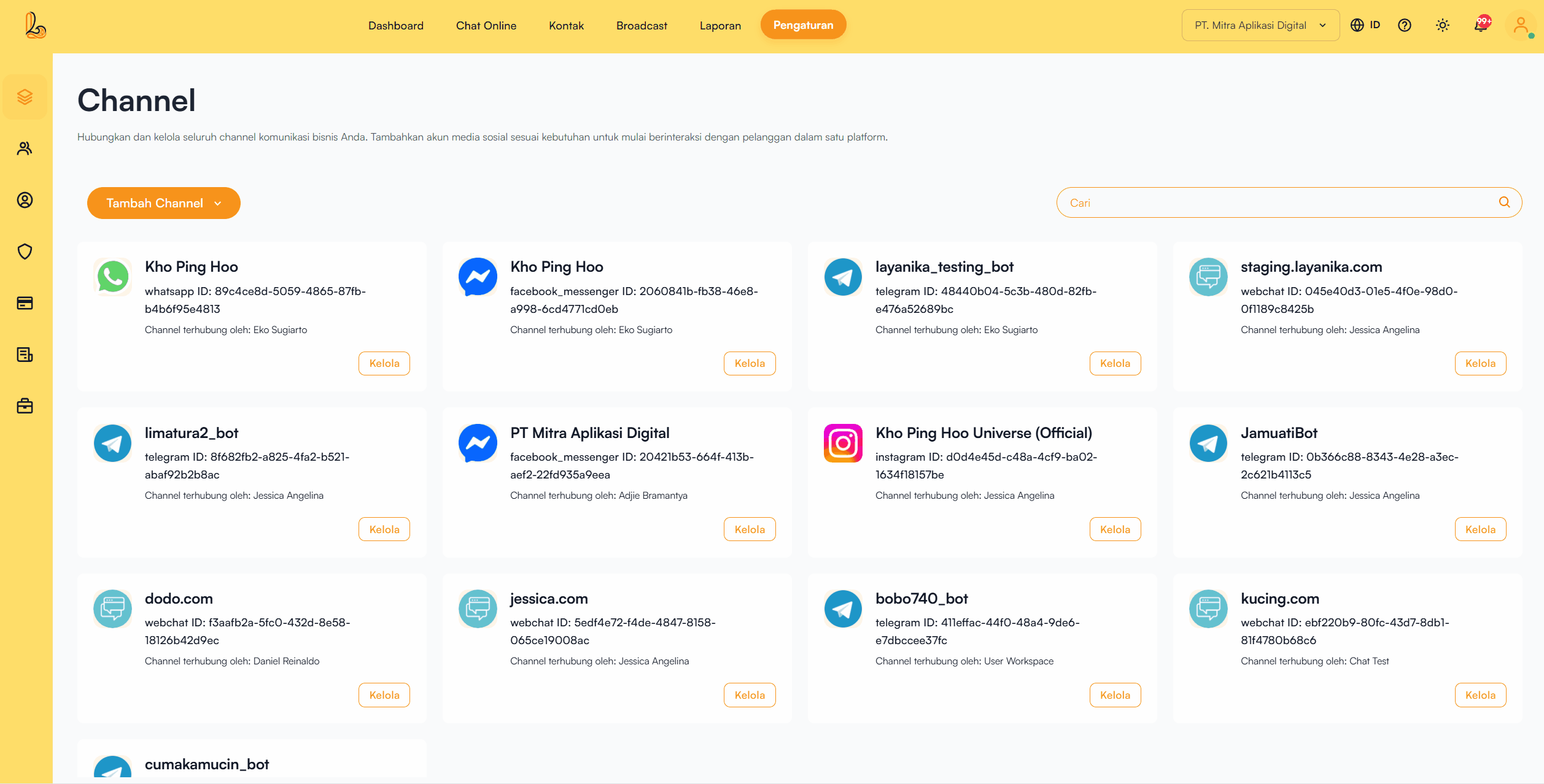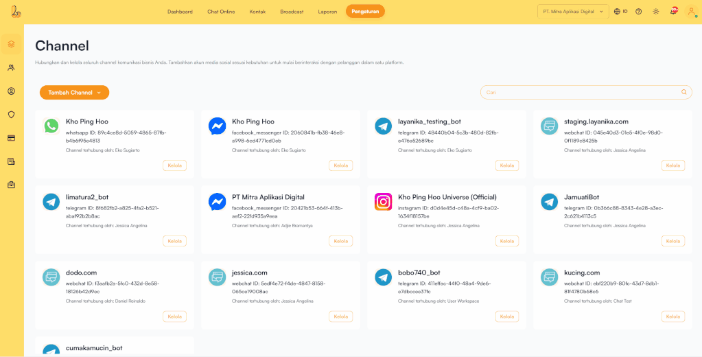 Channel adalah media komunikasi yang terhubung ke platform Layanika untuk mengirim dan menerima pesan dari pelanggan dalam satu sistem terpusat (omnichannel).
