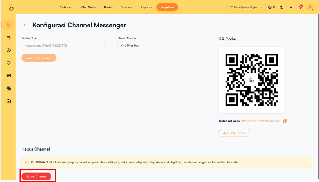 Pengguna dapat mengubah nama channel, menyalin tautan, serta mengunduh kode QR melalui Konfigurasi Facebook Messenger.
