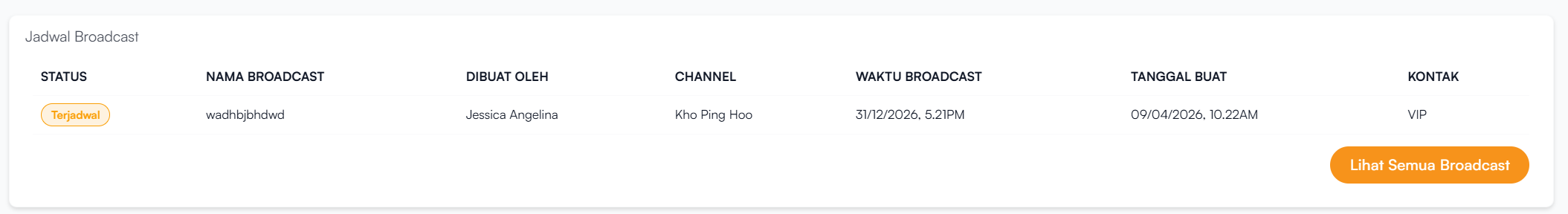 Bagian Jadwal Broadcast yang ada di Dashboard berfungsi untuk menampilkan informasi daftar broadcast yang telah dijadwalkan untuk dikirim