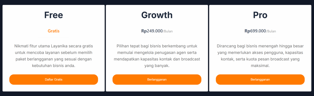 Melalui sistem langganan, pengguna dapat memilih paket yang sesuai dengan kebutuhan bisnis, seperti Free, Growth, atau Pro.