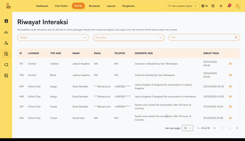 Pada menu Riwayat Interaksi menampilkan daftar interaksi pengguna dengan pelanggan. Menu ini memudahkan pengguna untuk memantau aktivitas tim serta pelanggan dengan melihat riwayat penugasan, penutupan chat, serta aktivitas kontak lainnya.
