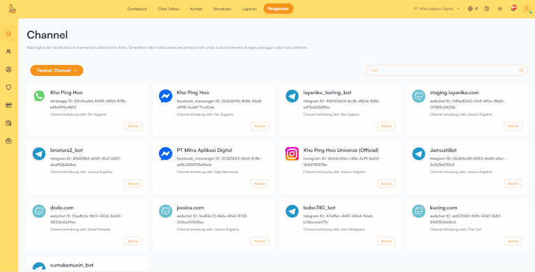 Buka menu Pengaturan, lalu pilih menu Channel. Klik tombol Tambah Channel, lalu pilih WhatsApp.